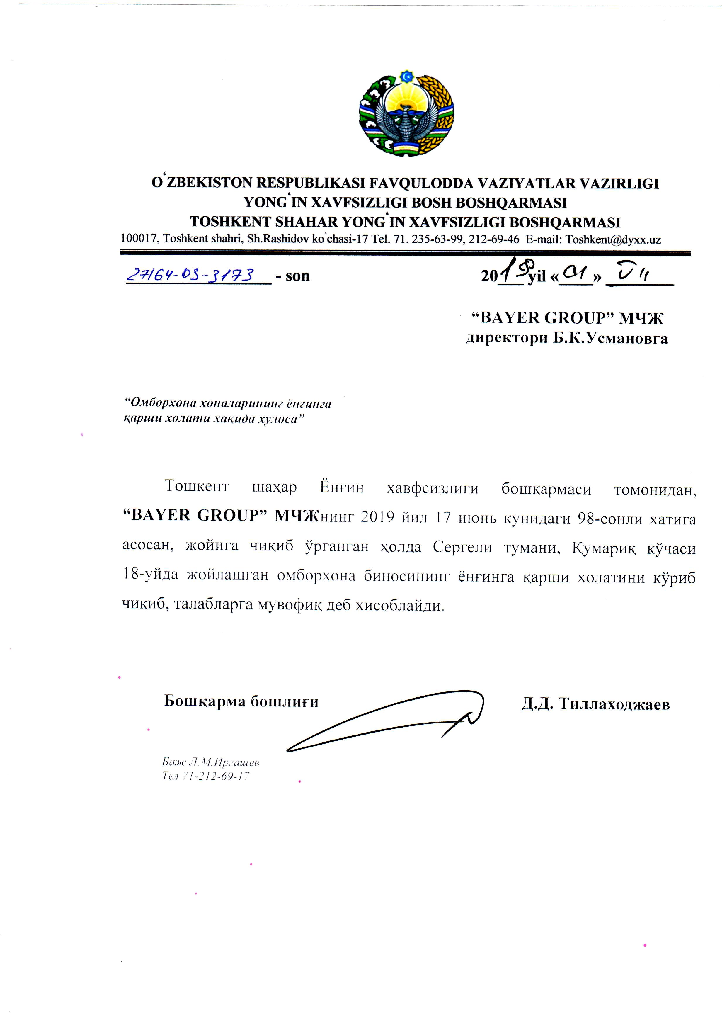 Письмо от Центр Государственного санитарно-эпидемиологического надзора г. Ташкента на подтверждения хранение лекарственных препаратов и медицинского оборудования.
